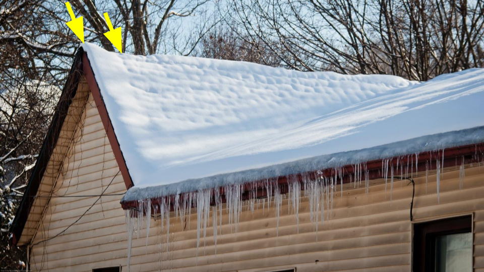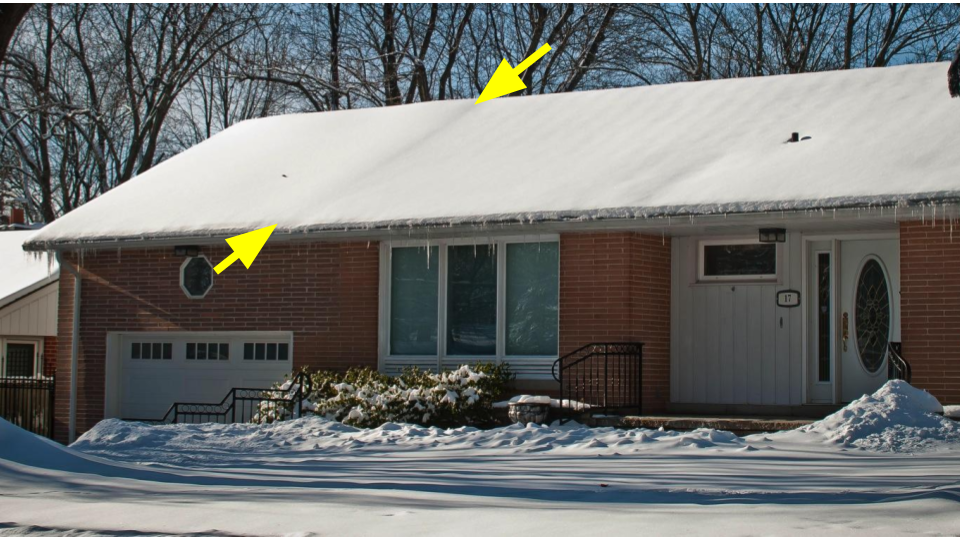 The dimples on the roof tell us that the attic space below it has little or no insulation in it. Of course, the moisture from all of the melting eventually winds up as icicles. The striking thing to see here is how much thicker the snow is between the two yellow arrows (left peak of the roof). This area of the roof is outside of the home and has little heat from below to melt it allowing the snow to remain thicker than the rest of the roof.